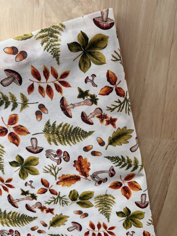 Mantel antimanchas otoñal de hojas y setas.